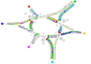Shown below is a snapshot from the individual vehicle animation available after running a TRANSYT Simulation model for a signalised roundabout. Each coloured block represents a vehicle, with the colours signifying the vehicle destinations (coloured locations at the edge of the network). The animation shows both queued vehicles waiting at stop lines, and also a representation of vehicles moving at their cruise speed along links and connectors.