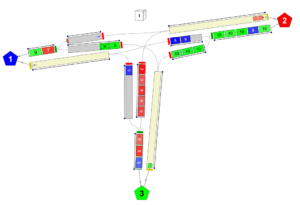 The animation snapshot below shows examples of blocking and lane starvation. The vehicles are colour-coded by destination, and also show the path ID assigned to each vehicle. On the southern arm, there is a blue vehicle in the upstream queue but it cannot enter the appropriate downstream lane because it is blocked by queueing red vehicles in front. (In this example, the turning proportions are such that most vehicles turn right, headed to Location 2). Due to this, the lane for left-turners on the southern arm is mostly empty and under-utilised. The simulation results and animations will help to reveal whether this is an occasional occurrence or whether it happens regularly.